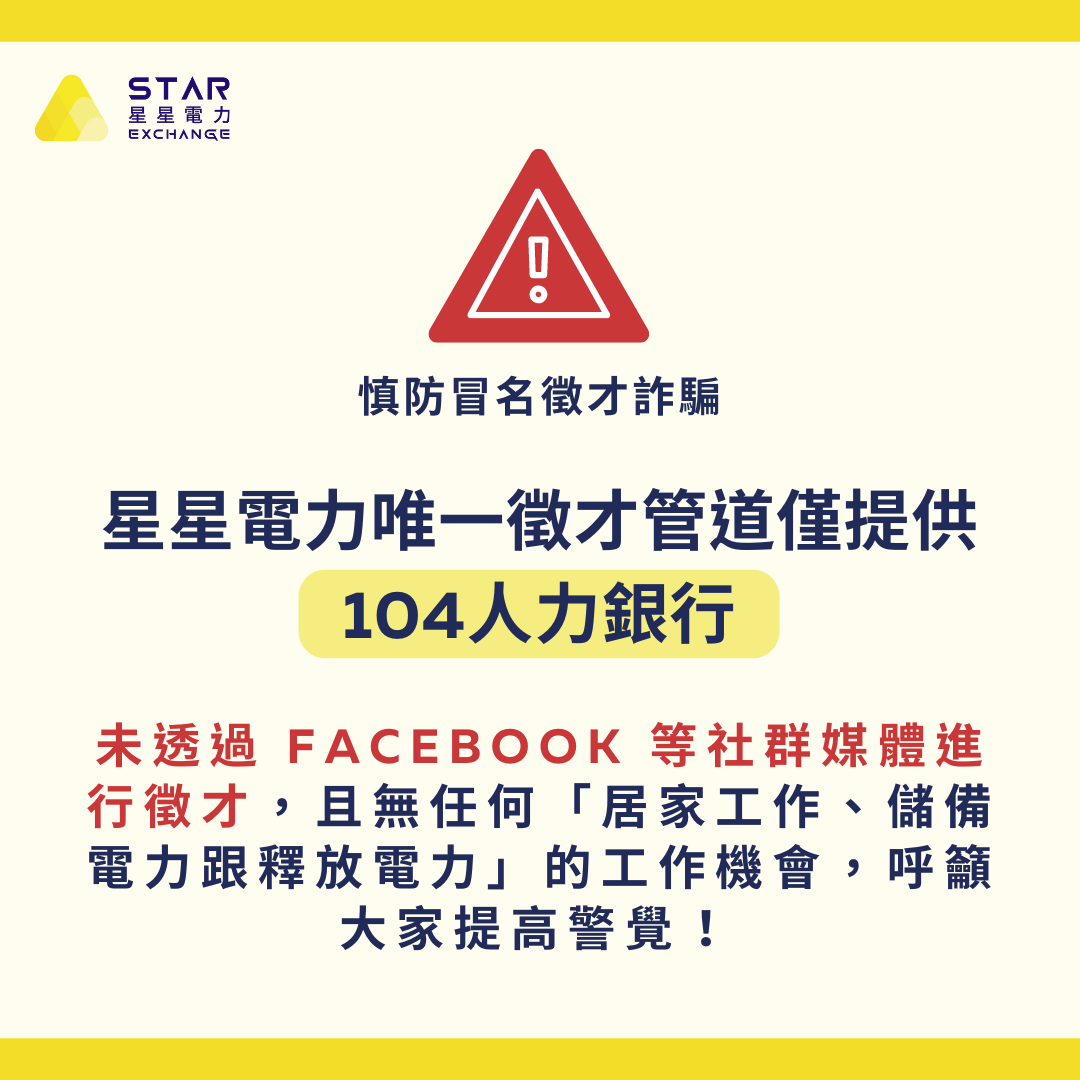 再次提醒您,星星電力絕未在104人力銀行以外的管道刊登徵才資訊